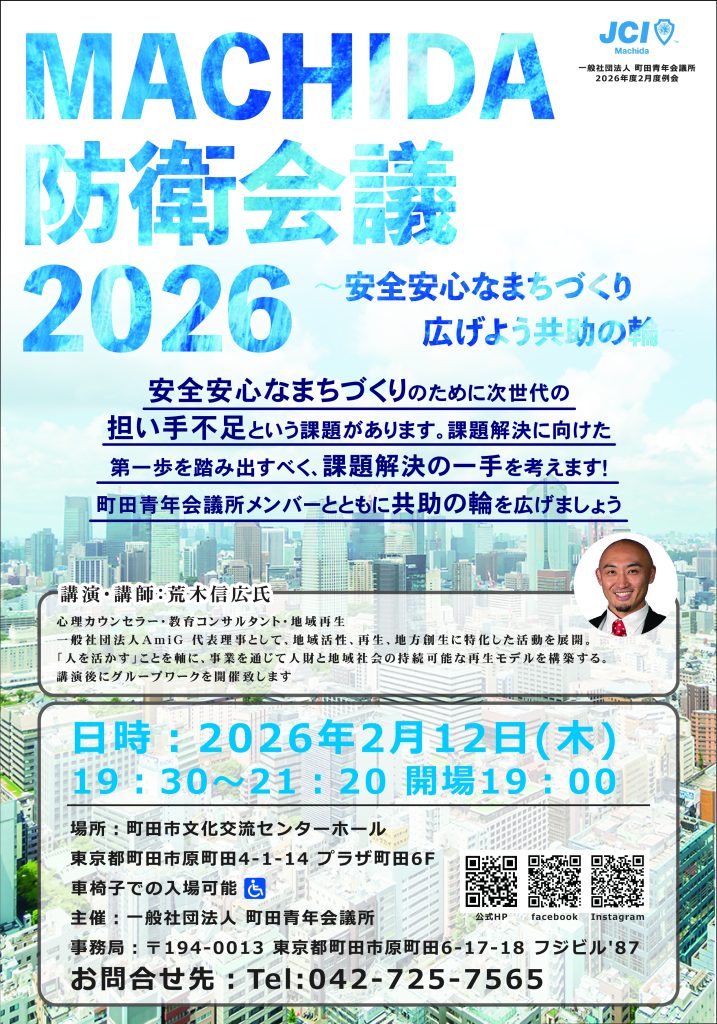 一般社団法人町田青年会議所2026年度2月度例会『MACHIDA防衛会議2026~安全安心なまちづくり広げよう共助の輪~』を開催いたします。